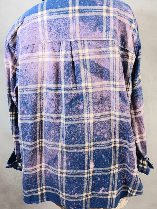 Blue, Green, Brown and White Checked Bleached & Repurposed Flannel Shirt