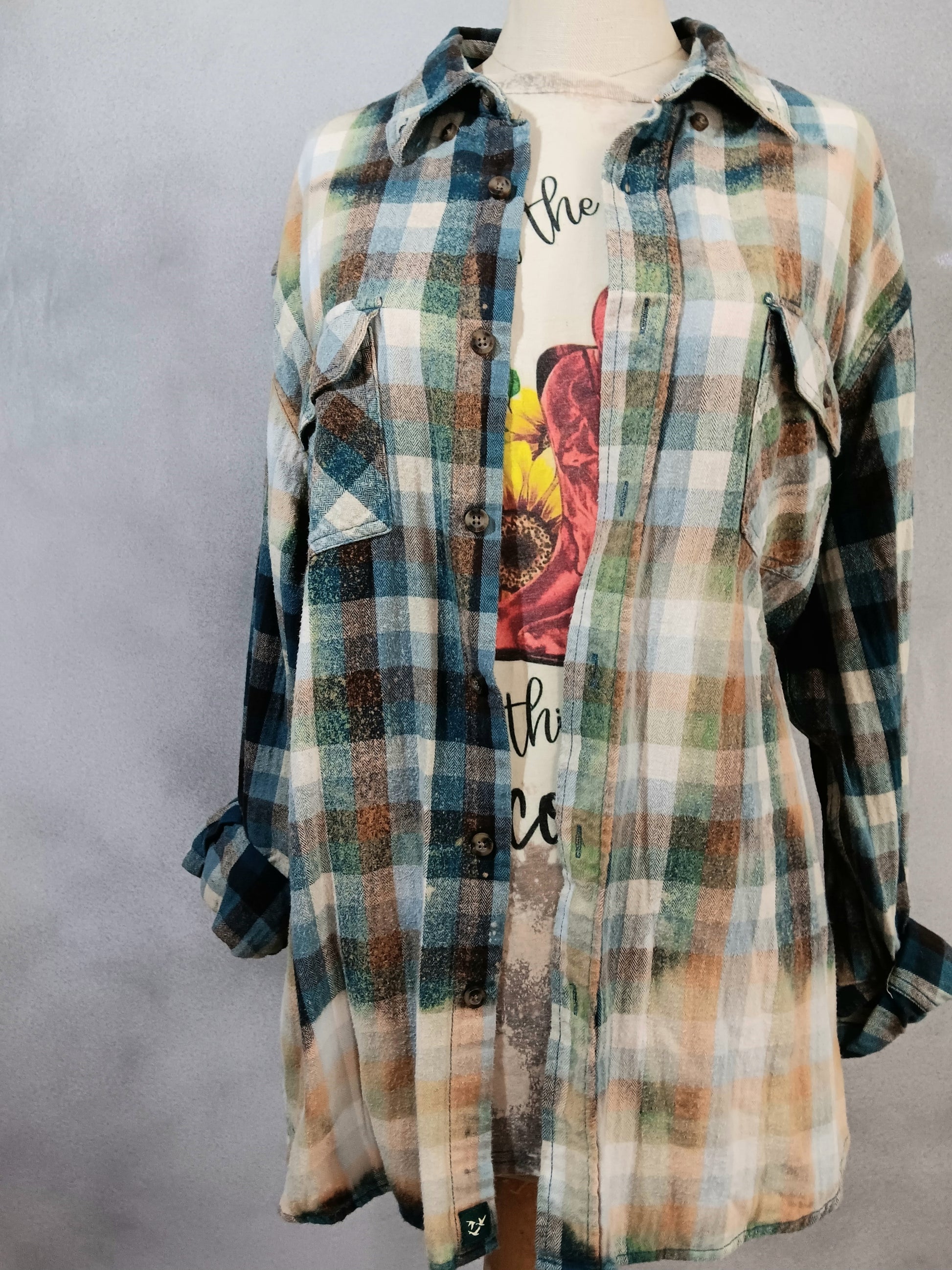 Blue, Green, Brown and White Checked Bleached & Repurposed Flannel Shirt