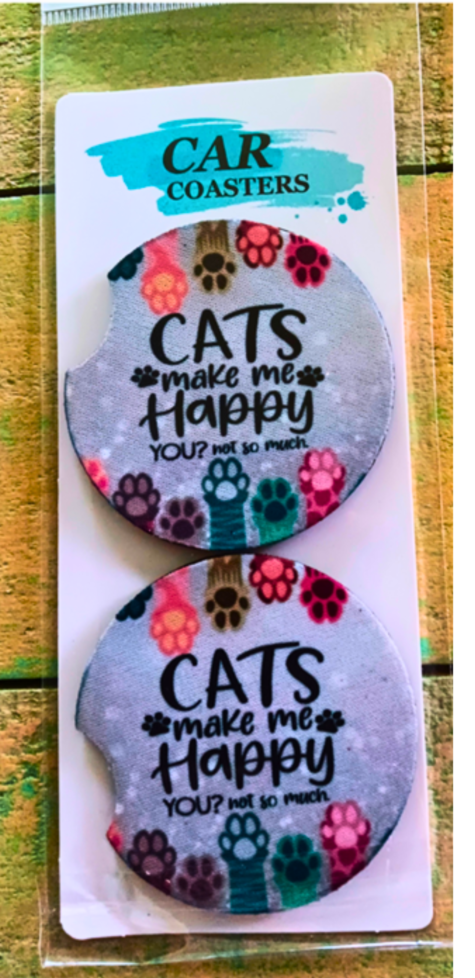Our car coasters come in a variety of snarky sayings and images and come packaged on a card in plastic, 2 to a package.