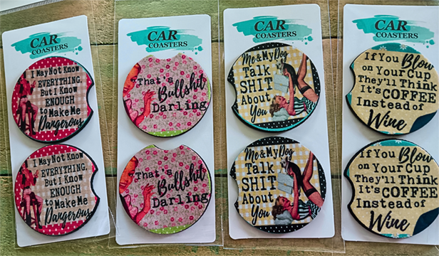 Our car coasters come in a variety of snarky sayings and images and come packaged on a card in plastic, 2 to a package.