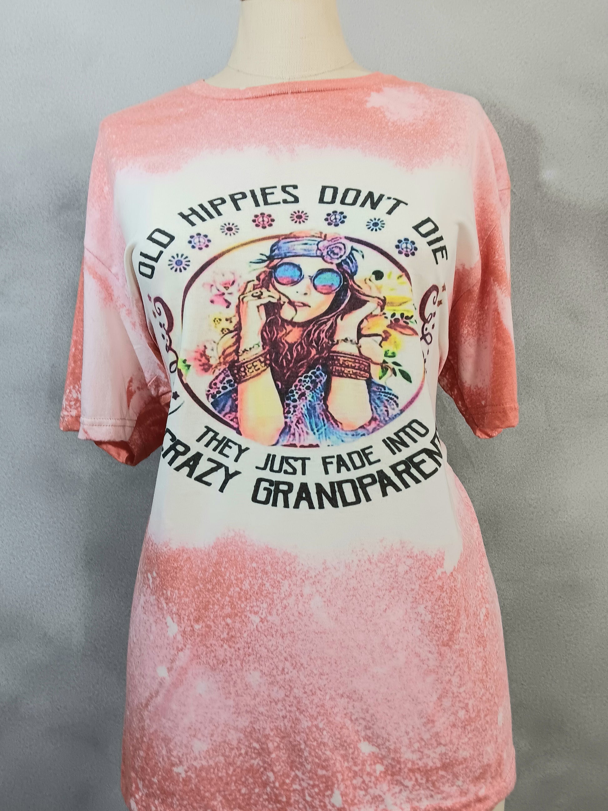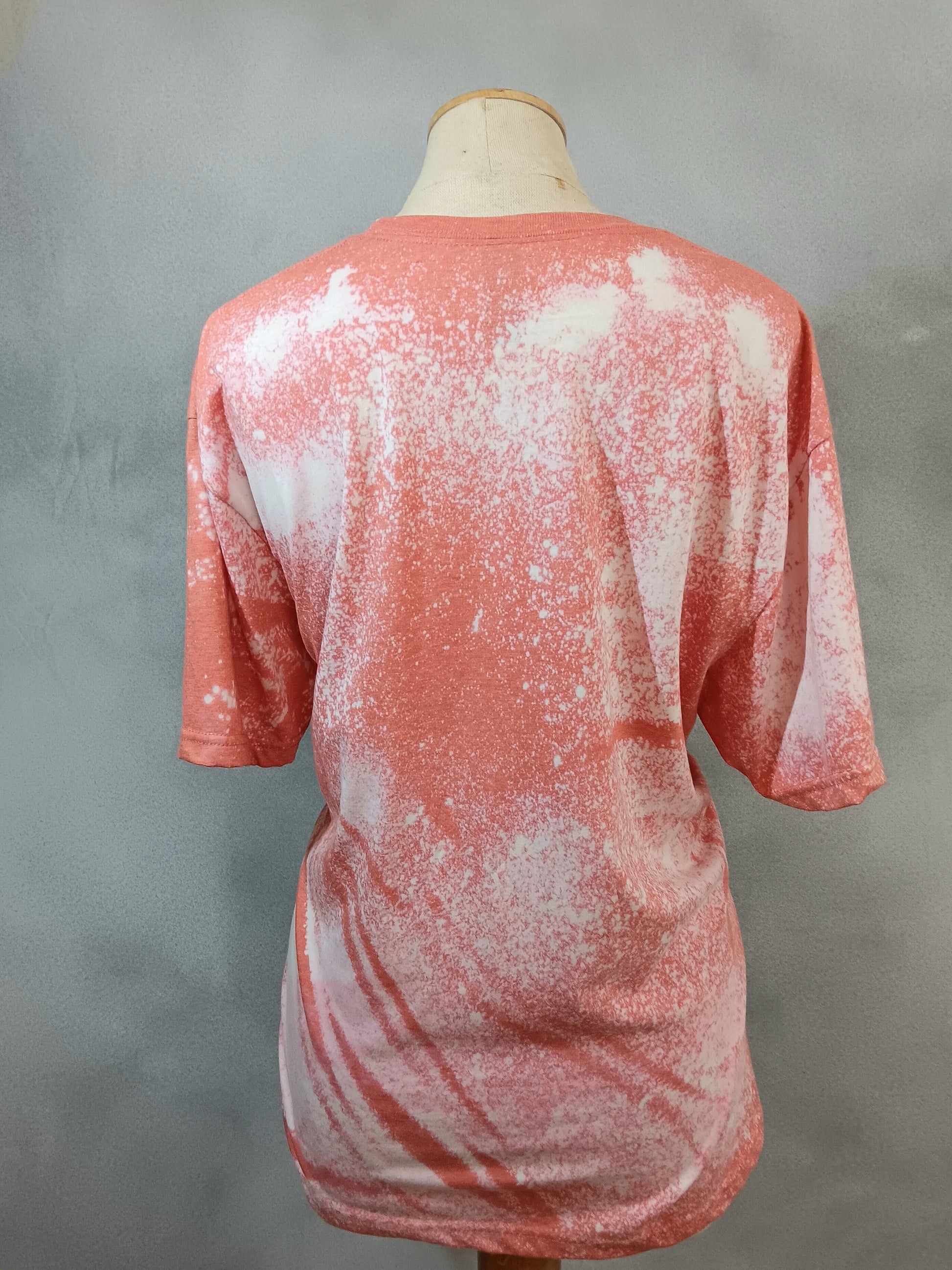 Each shirt is hand bleached and dried in the sun so no 2 shirts are exactly alike. Bleaching will vary slightly. I also bleach the back and you can see that in one of the photos.